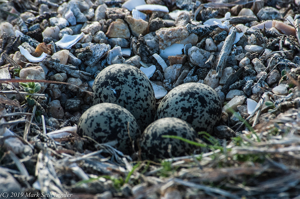 Killdeer nest on and near the beach just like terns. They are named after their “K’dee” call. Killdeer eggs, like tern eggs and nests are camouflaged and hard to see. If killdeer fly around you and call their “K’dee” call, STOP! You are about to step on their nests!
