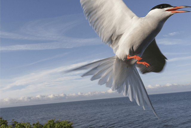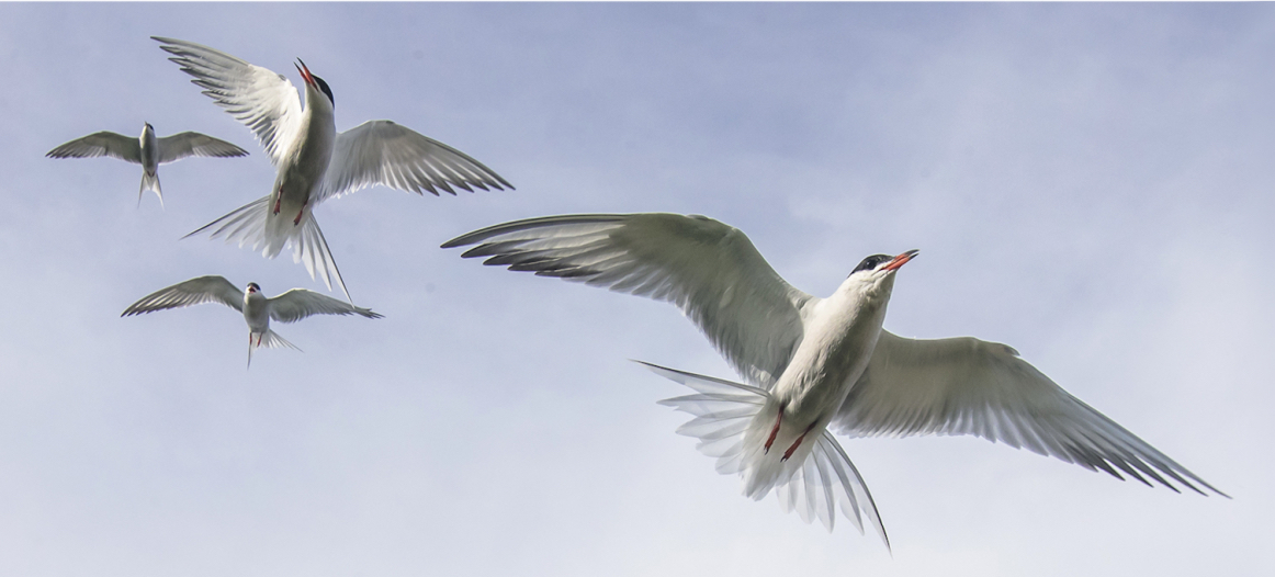 Common Terns have wings that are gray on top and white underneath. They have red beaks and red feet and black caps on their heads. And like Osprey, they hover when trying to spot a fish except terns hover much closer to the water.
