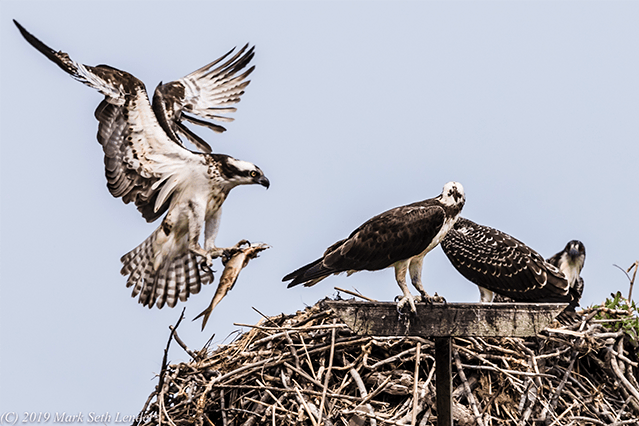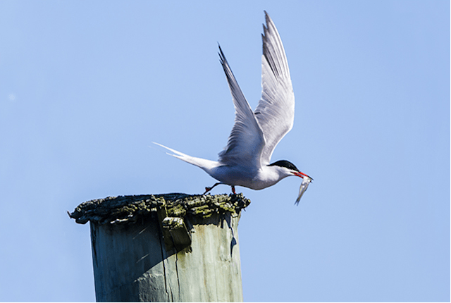 Osprey catch fish with the sharp talons on their feet. Terns catch fish with their beaks. Because Osprey catch larger fish they always carry them to a perch to eat. Terns catch fish small enough to swallow whole, right then and there. However, if you see a Tern in flight with a fish dangling from its beak, chances are there are hungry babies in the nest waiting to be fed.