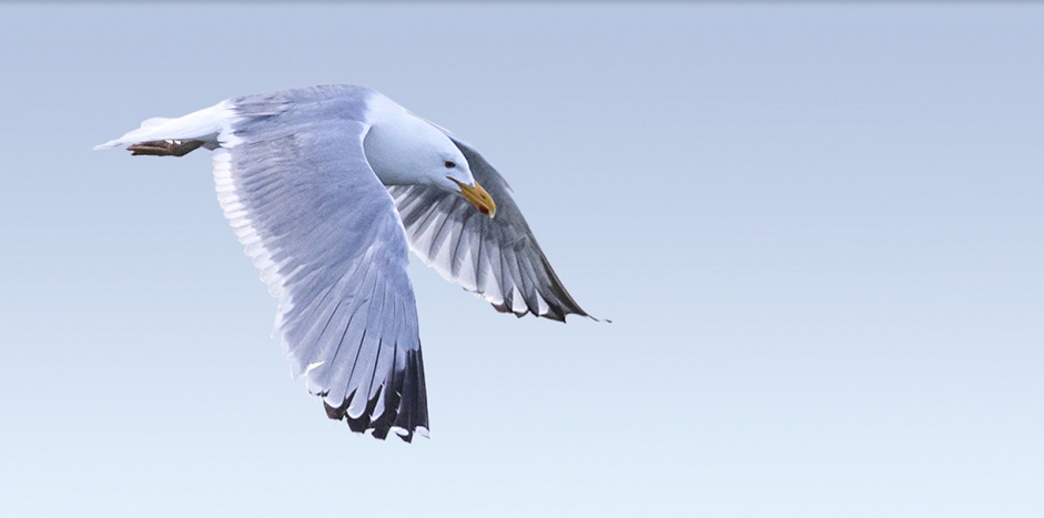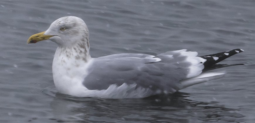 Herring Gulls, like Smeagull the Seagull, have wings that are gray on top. They have a yellow beak and are white underneath.