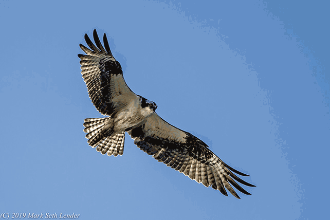 Osprey wings look mostly black underneath with some white and on top the wings look pretty much all black. Actually, up close, all that black is a very dark brown. Osprey are large birds (their wingspan, wingtip to wingtip, can be nearly 6 feet) and… they can hover.